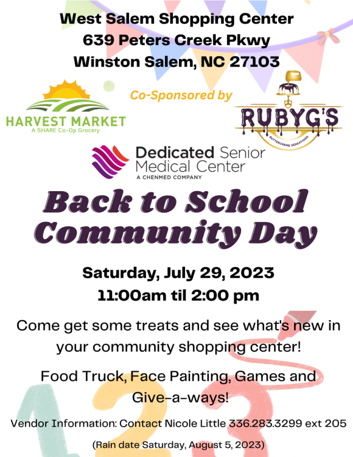 Come join in the fun July 29 from 11 am until 2 pm as the merchants of West Salem Shopping Center host a day of games, prizes, a food truck, and much more! Free school supplies will be distributed to elementary and middle school students while supplies last. The Winston-Salem Fire Department will have a firetruck on hand and the National Guard will have a Humvee vehicle to show off. There will be bingo games and a DJ playing music. Don’t miss the fun!