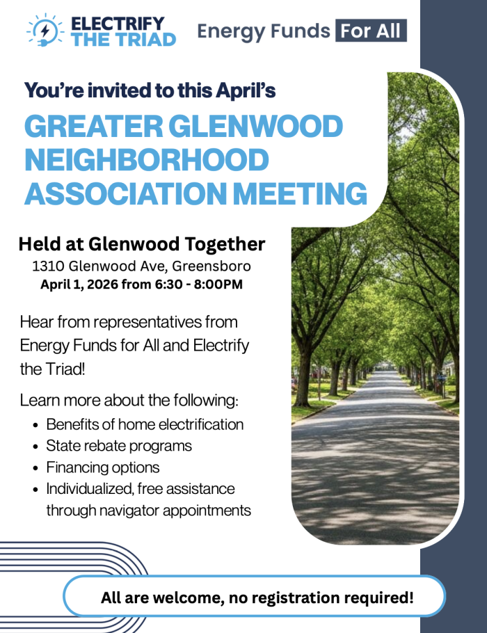 Start making your plan for a more affordable, energy efficient home. Hear from representatives from Energy Funds for All and Electrify the Triad at the Greater Glenwood Neighborhood Association meeting on April 1, 2026 from 6:30 - 8:00PM