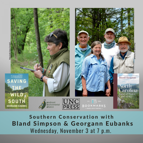 Join Bookmarks, UNC Press, and the Piedmont Environmental Alliance (PEA) for a conversation with Bland Simpson & Georgann Eubanks as they discuss environmental conservation in the south and their books on Wednesday, November 3 at 7 pm!