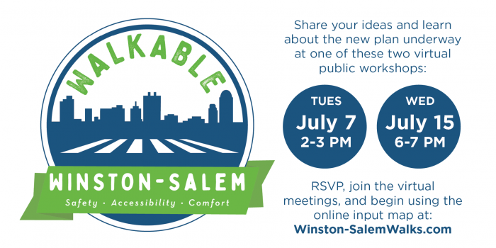 Join the Steering Committee for the Winston-Salem Pedestrian Plan for a virtual open house. This event is part of the learning phase for the committee to evaluate the problems of our existing transportation network and draft a plan for improved pedestrian spaces. This workshop will take place on Wednesday, July 15th at 6 pm over Zoom. Click here for more information.