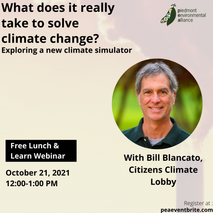 Participants in this Lunch & Learn will use a transparent, freely-available policy simulation model (the En-ROADS Climate Change Solutions Simulator) to design their own scenarios to limit future global warming. Join us on October 21st at noon with Bill Blancato from Citizens Climate Lobby to learn about what it takes to solve climate change. This event will be virtual, via zoom. To register and find more information, click here.